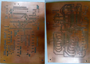 v5a. He fet servir mètode de la planxa i àcid. Ha anat força, el mètoe de la planxa eś eficient, tot i que he malmès la placa. He fet servir una combinació de CNC i planxa que s'ha demostrat bastant efectiva. Primer faig els drills de la placa (amb els 4 forats de referència, també a 0,65-0,7mm). Aleshores amb el mètode de la planxa faig les dues cares. Trec el paper (difícil saber quan has de parar), i ataco amb àcid i aigua oxigenada (correcta, però difícil saber quan has de parar. Si et passes, poden quedar les pistes massa primes). De totes maneres, encara que he malmès la placa, és una bona opció.